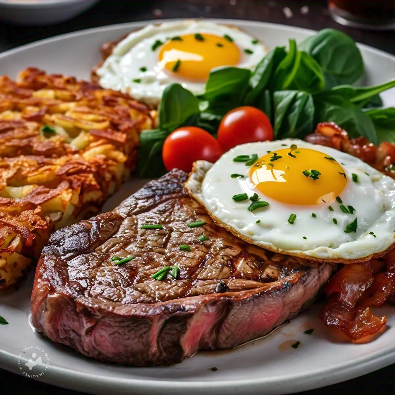 A hearty breakfast featuring a perfectly cooked steak paired with a freshly prepared egg. Served with golden Beef Tallow Friesâ„¢ and your choice of drink.