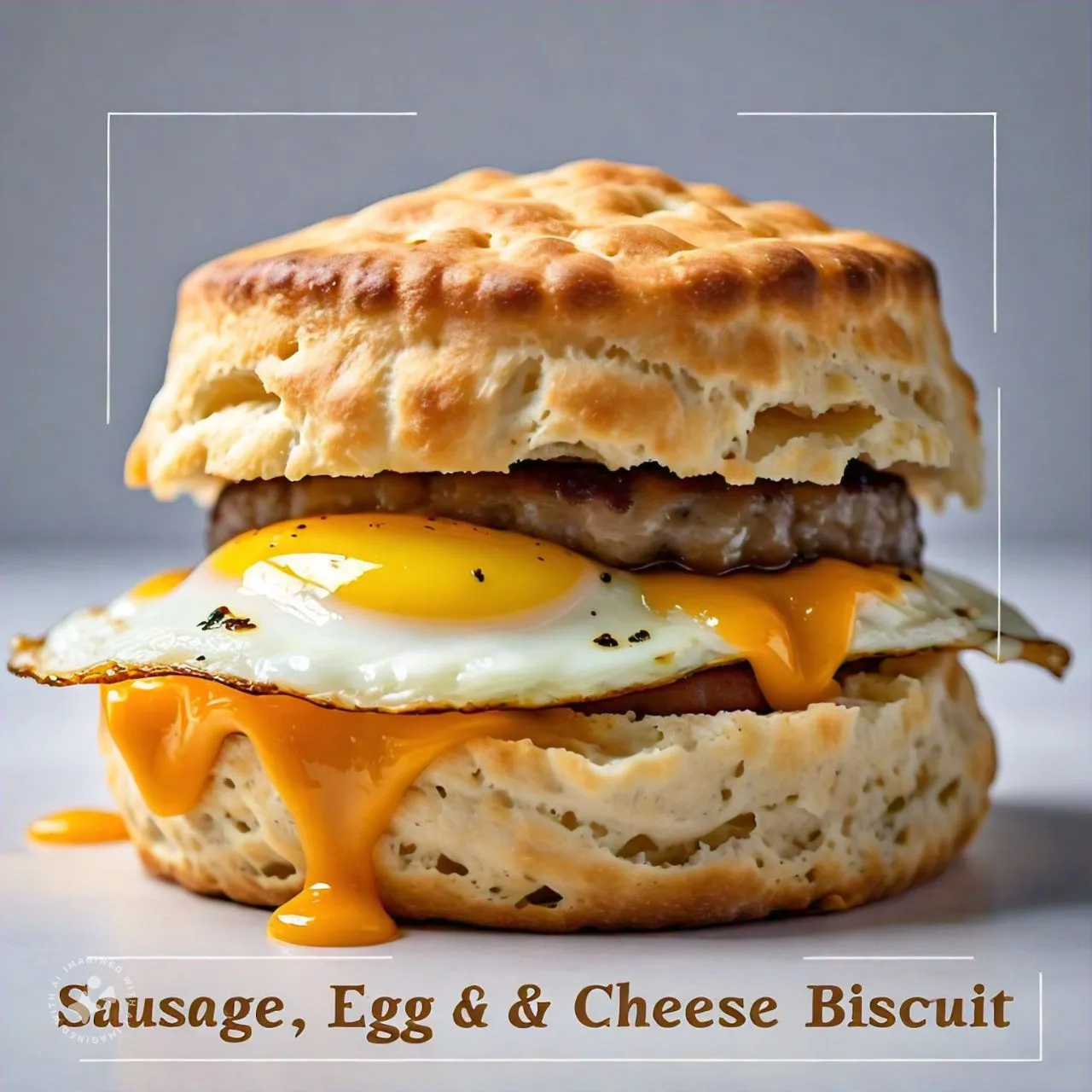 A warm, flaky biscuit filled with savory sausage, a freshly cooked egg, and melted American cheese. Served with crispy Beef Tallow Friesâ„¢ and your choice of drink.