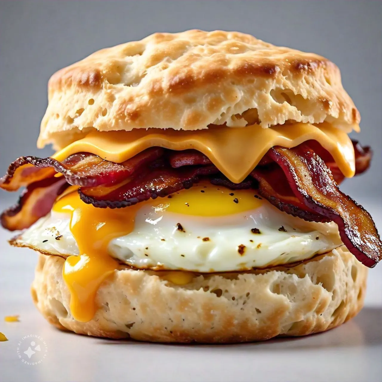 A warm, buttery biscuit stacked with crispy bacon, a freshly cooked egg, and melted American cheese. Served with Beef Tallow Friesâ„¢ and a drink.
