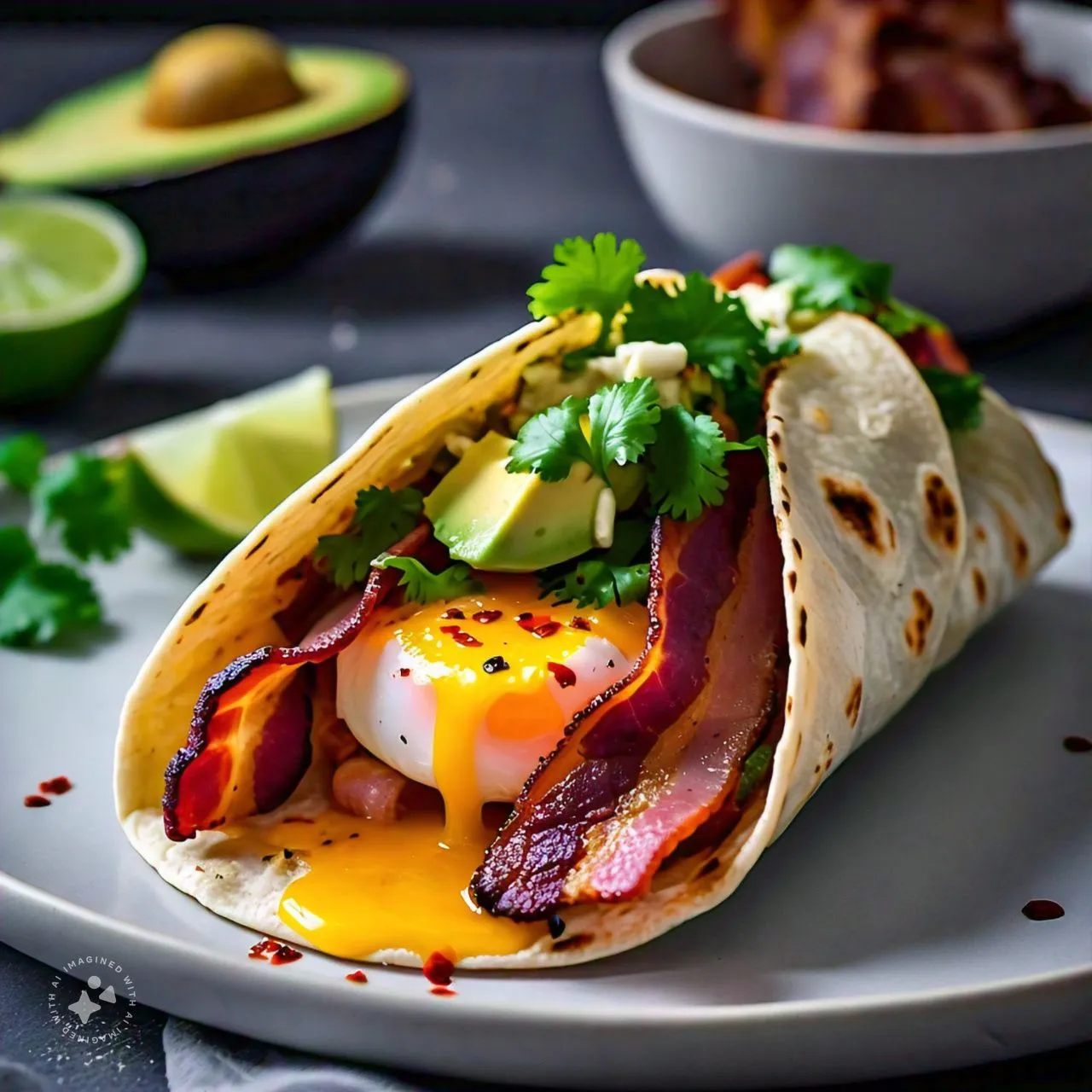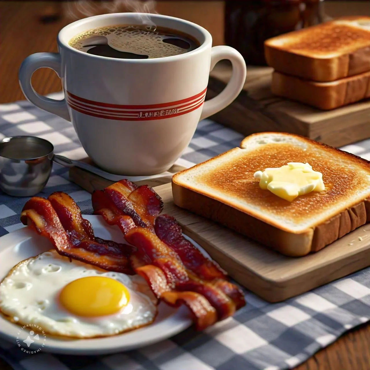 A hearty breakfast plate featuring crispy bacon, a freshly cooked egg, and golden, buttery toast. Served with your choice of drink and a side of crispy Beef Tallow Friesâ„¢.